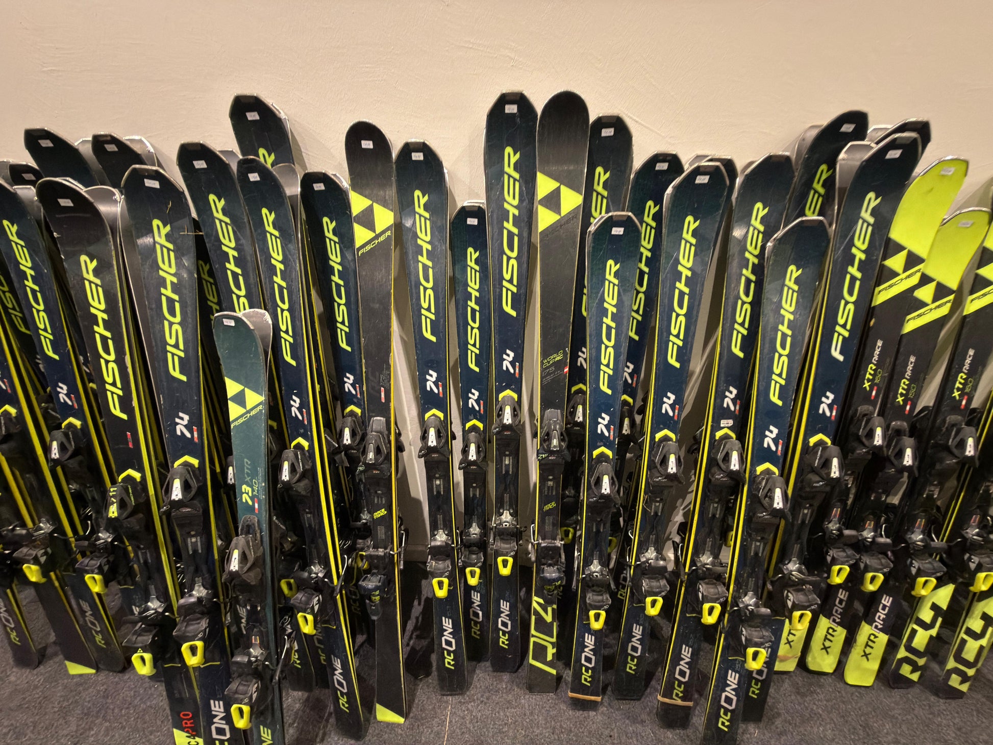 Dit rek is gevuld met de volgende skis: